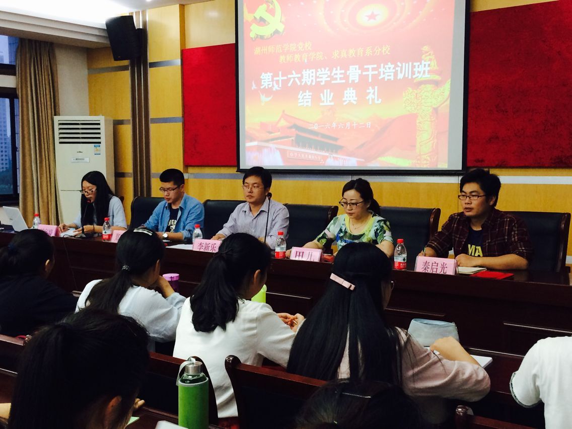 2016年6月12日晚6:30,js3845金沙线路党校js3845金沙线路、求真教育系分校第十六期学生骨干培训班结业典礼于10幢五楼报告厅准时开始。学院院长助理、校务委员会副主任李新乐老师,学院学工办主任、校务委员会委员田儿老师,学院辅导员、校务委员会委员郑晓锋老师,学院辅导员、校务委员会委员秦启光老师,党务管理中心理论学习部潘宇婷同学以及155位学员参加了此次结业典礼。
