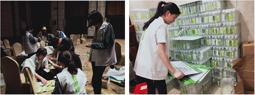 5月10日晚,志愿者们为嘉宾们准备好胸牌、餐券、铅笔、书籍、地图等各项物资。