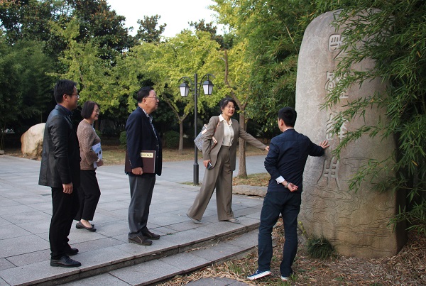 座谈会结束后师生陪同胡运熹夫妇到胡瑗广场参观,沈国丰书记向大家介绍了胡瑗广场的设计理念及校训石等景观的来历,胡运熹夫妇对我校重视胡瑗教育思想的传承感到非常的欣慰。