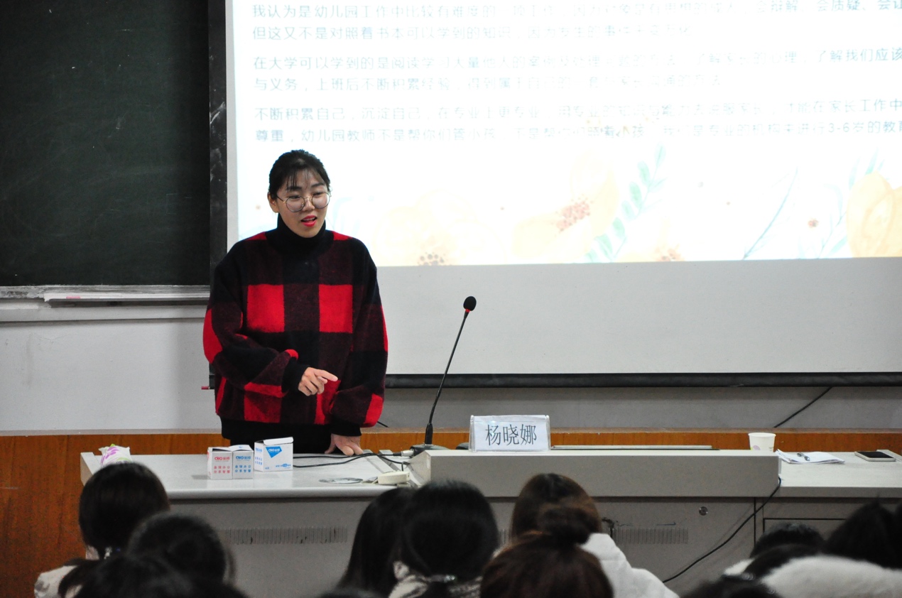首先,杨晓娜分享了她对专业的观点,告诉学生一定要端正学习态度,加强对学前专业理论知识的学习和专业技能的训练,为今后的实践教学奠定坚实的基础。然后,杨晓娜还分享了自己在工作后得到的经验,告诉大一新生如果想要做一名优秀的幼儿教师,应该要向五个方向努力,包括了基本功、环境创设、教育教学活动、家长工作、班级管理等方面。