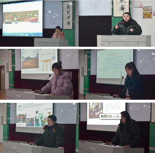 来自17级的钟童烨、郑喆纯、许锦霞、董家琦、陈芸菲和沈逸芸六位代表依次进行了经验上的分享。她们首先介绍了各自幼儿园的特点,并从实习的保育工作、集体教学活动中师幼互动、环境创设、幼儿游戏观察等多个方面进行了详细的介绍。