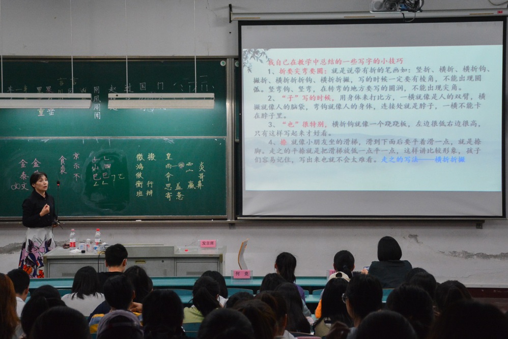 何竞老师从粉笔字的书写姿势、执笔方法、运笔方法、笔画顺序、板书设计及自身的教学体会等方面展开了精彩的讲座。何老师在讲座过程中结合汉字的结构书写特点边讲解边演示,为师范生展示了优美的粉笔字板书以及深厚的汉字文化功底。汉字的一笔一画均体现了中华文化的博大精深,师范生掌握一手规范美观、整洁清楚的三笔字是“学为人师,行为世范”的最好体现。小教系一直以来非常重视师范生基本功训练,讲座后,学生均表示受益匪浅。