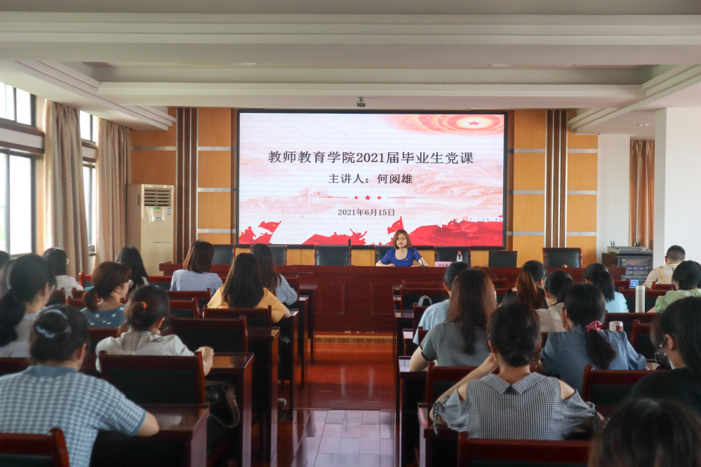 在毕业生党员离校教育会上,何阅雄为全体毕业班学生党员上最后一堂党课,她强调:我们全体毕业生党员进入新的党组织以后,要认真参加组织生活,要听党指挥、学党史感党恩,在工作岗位上要充分发挥先锋模范作用,努力成为一名优秀的共产党员。她告诫大家作为青年党员要勇担时代使命,谨守教书育人职责。她希望全体毕业生党员坚守初心,牢记“立德树人”根本使命,努力成为一名“大先生”。
