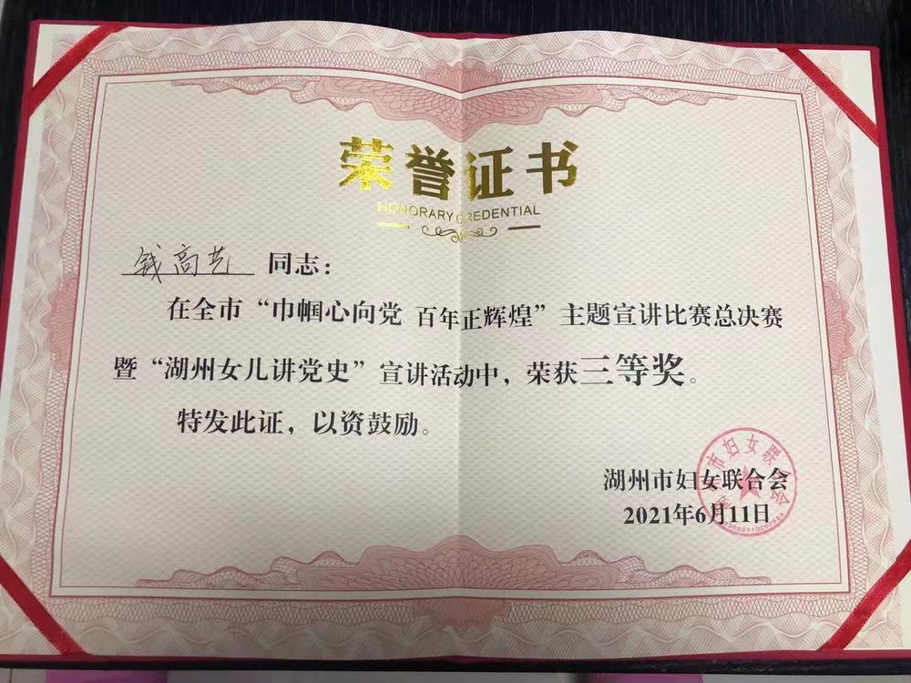 为庆祝中国共产党成立100周年,深入开展党史学习教育,进一步团结引领广大妇女群众听党话、跟党走,在全社会营造学“四史”、颂党恩的浓厚氛围,6月11日下午,湖州市妇联举办“巾帼心向党·百年正辉煌”主题宣讲比赛总决赛暨“湖州女儿讲党史”宣讲活动。我院小学教育专业20180211班学生钱高艺同学入围决赛,并最终获得三等奖的好成绩。