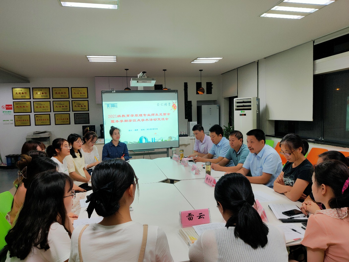 会上,主持人首先代表教育思想与文化研究中心向新报到的9位2021级教育学原理专业硕士生表示欢迎,并具体介绍了教育学原理硕士点基本情况。随后,9位新生依次对自身的基本情况、学业理想进行介绍,学位点导师分别就自身的研究方向、研究专长以及对学生的期待和建议进行分享,师生双方还就本学期学位点学术活动进行了交流互动。最后,教育学原理专业负责人舒志定教授向新生们提出了五点建议:第一,从同学们的学业背景来看,需要自觉及早立足教育学核心课程、教育经典名著补知识、补短板。第二,同学们要不断培养自身的问题意识,聚焦教育真问题勤写作、勤研究。第三,要回归教育劳动、教育现实,时刻关注教育新动态、教育新变革。第四,要有明确的目标和理想,做好三年研究生规划,形成具体的学业任务、职业理想。第五,要以饱满的精神和昂扬的斗志融入教育思想与文化研究中心的学习生活之中,努力学习,高质量完成自己的学业目标和理想。