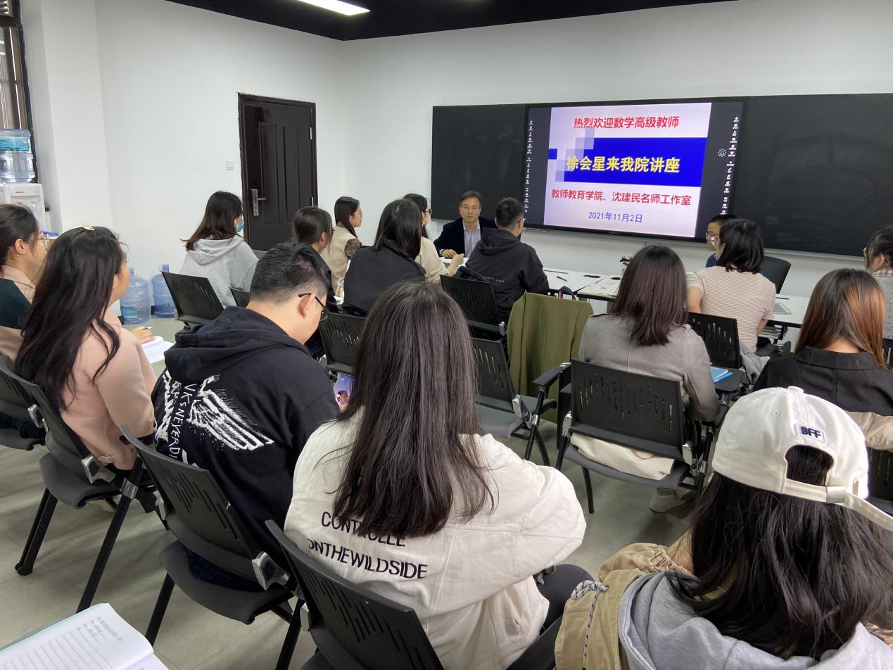 为提升我们研究生对基础教育一线教育教学实践的理性认识,沈建民名师工作室联合js3845金沙线路邀请湖州市环渚学校校长、数学高级教师徐会星老师于2021年11月2日下午在11幢413教室为学科教学(数学)领域方向30位研究生作了以“从新手走向能手——浅谈初中数学教师的三项本领”为主题的精彩讲座。讲座由学科教学数学领域(方向)负责人沈建民教授主持。