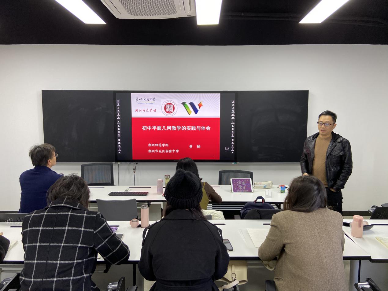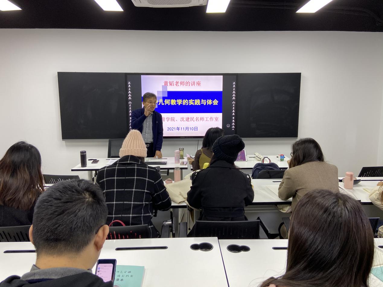 为推进研究生数学学科的教育教学技能,加深对初中几何教学本质的认识,沈建民名师工作室联合js3845金沙线路邀请黄韬老师于2021年11月10日上午在11幢413教室为学科教学(数学)方向的30位研究生作了题为“初中平面几何教学的实践与体会”的精彩讲座。讲座由学科教学数学领域(方向)负责人沈建民教授主持。