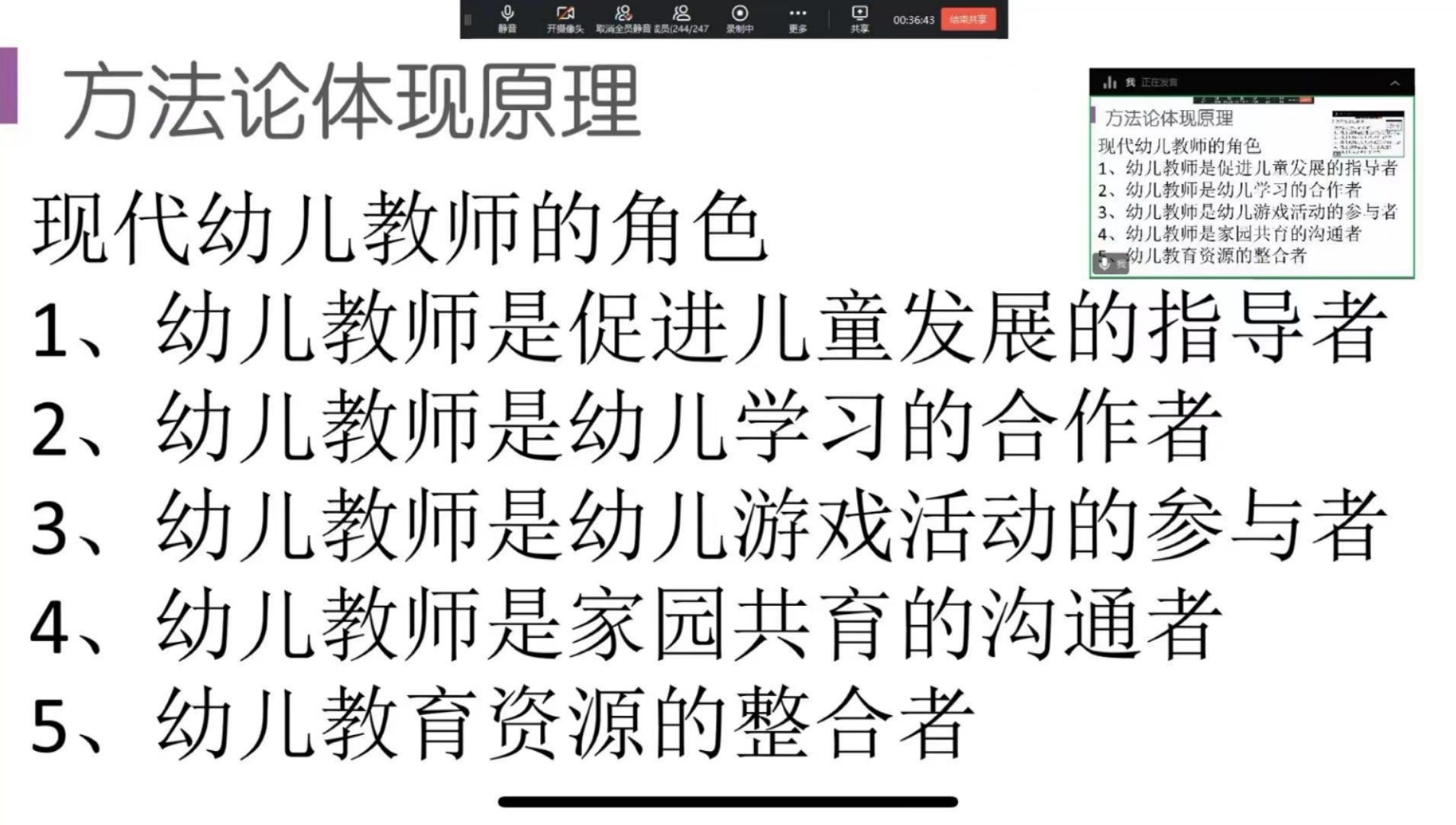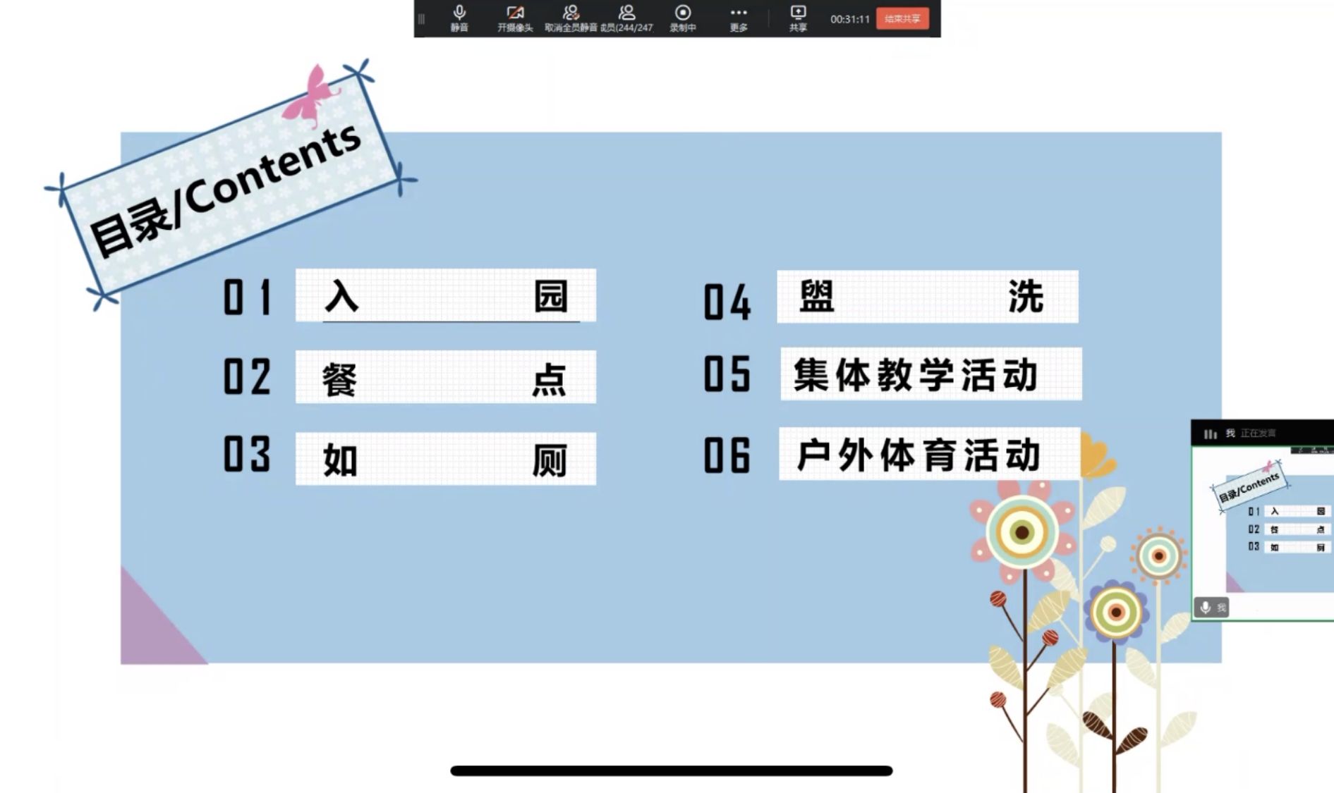 王琪同学从入园、餐点、如厕、盥洗、集体教学、户外体育活动六个部分入手,着重讲述了小朋友的问好、用餐等习惯问题。面对问题,老师们通过绘本故事、儿歌等方式加以引导,提供了正确教育孩子们的方法。