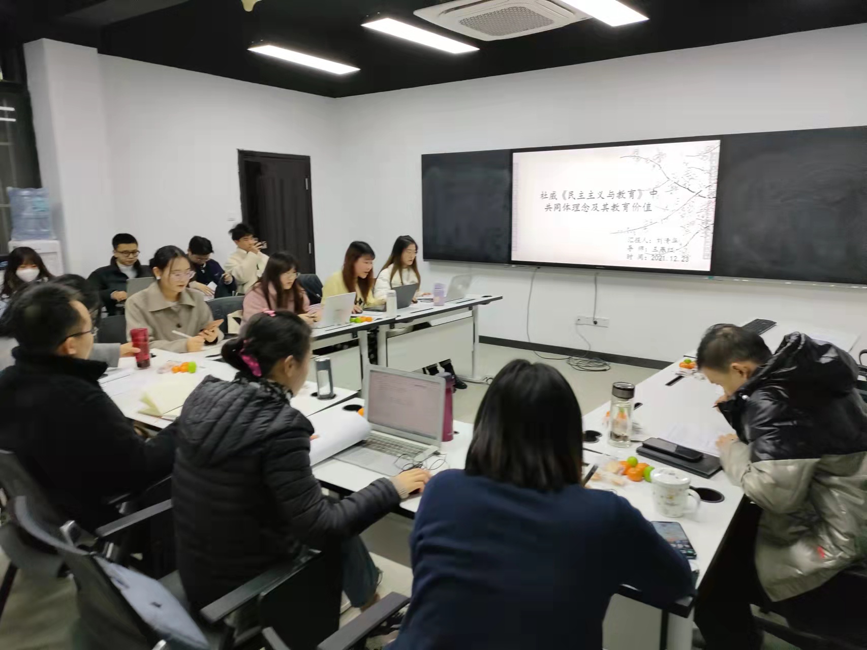 2021年12月23日晚,教育思想与文化研究中心工作坊第二十一期学术报告在11-413召开。报告主题是“杜威《民主主义与教育》中共同体理念及其教育价值”。中心负责人舒志定老师,中心成员牛长松、王贤德、王燕红、张震老师,2020级、2021级全体教育学原理专业和部分小学教育专业硕士生参加了此次活动。本次活动的汇报人是2021级硕士生刘清华,主持人是2021级硕士生刘华南。