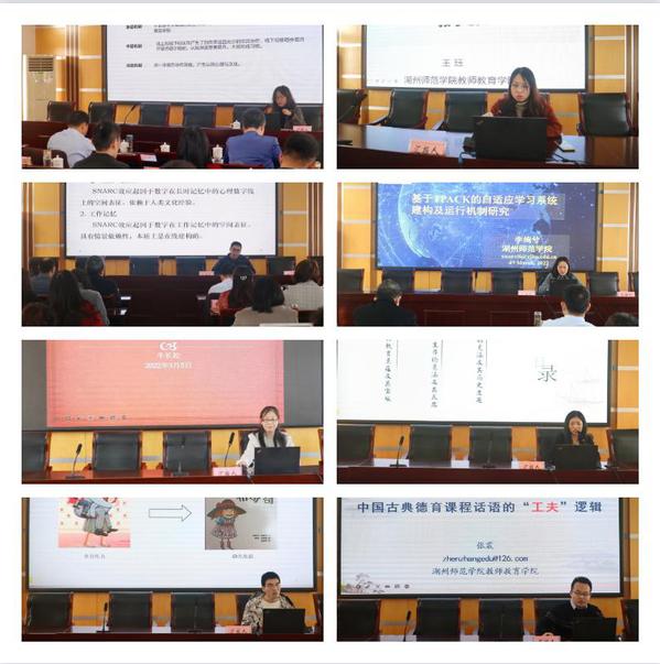 在主题报告环节,由胡水星教授和宋立华教授先后担任主持。陈羽洁博士做有关知识建构社区际遇性协作机制研究方面的报告:通过三轮迭代的教育实践,对三层促进机制对知识建构社区际遇性协作的影响这一领域进行了深入探索。王强强博士对不同干扰情境中数字SNARC效应情况做汇报,并进行数字空间表征的在线建构尝试。王珏博士对智慧教室中基于APT的教学创新结合实践做了分享:结果表明,合理地运用APT教学模式进行智慧教学,可以改善学生学习效果。李绚兮博士对基于TPACK的自适应学习系统建构及运行机制进行了研究,在报告中进行了充分的讲解。牛长松博士关注了国际教育援助领域,深入探讨了其在有效性视角下的发展和变革。马进博士则对于“格物”精神的内涵以及其在教育领域的实践进行汇报。王英杰博士则重点关注母亲养育压力与幼儿焦虑的关系,从研究假设出发,结合多个模型对研究议题进行剖析。张震博士对古典德育课堂实施了深入的研究,给予听众诸多启迪。