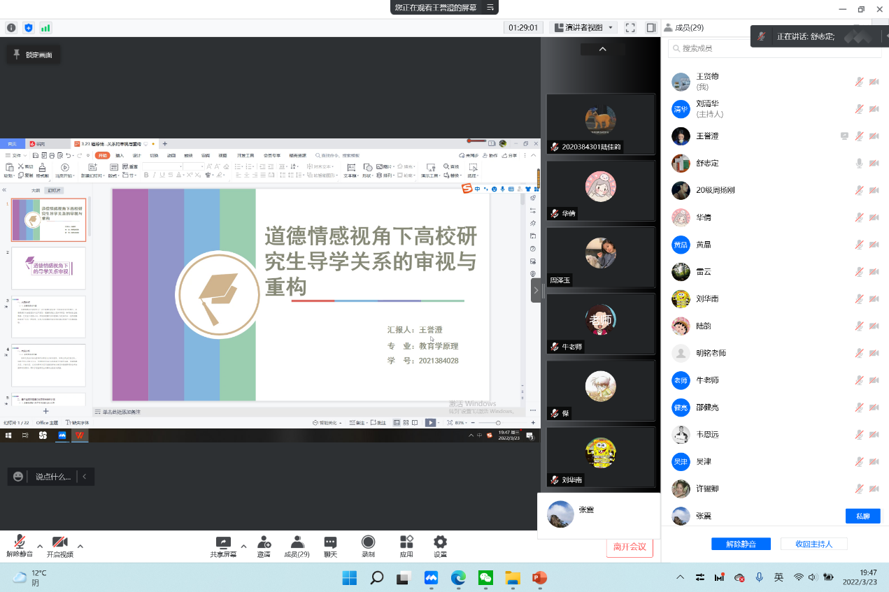 2022年3月23日晚,教育思想与文化研究中心工作坊第二十三期学术报告通过腾讯会议线上召开。报告主题是“道德情感视角下高校研究生导学关系的审视与重构”。中心负责人舒志定老师,中心成员牛长松、王贤德、王燕红、张震、亢明铭、雷云、陆韵老师,2020级、2021级全体教育学原理专业和部分小学教育专业硕士生参加了此次活动。本次活动的汇报人是2021级硕士生王誉澄,主持人是2021级硕士生刘华南。