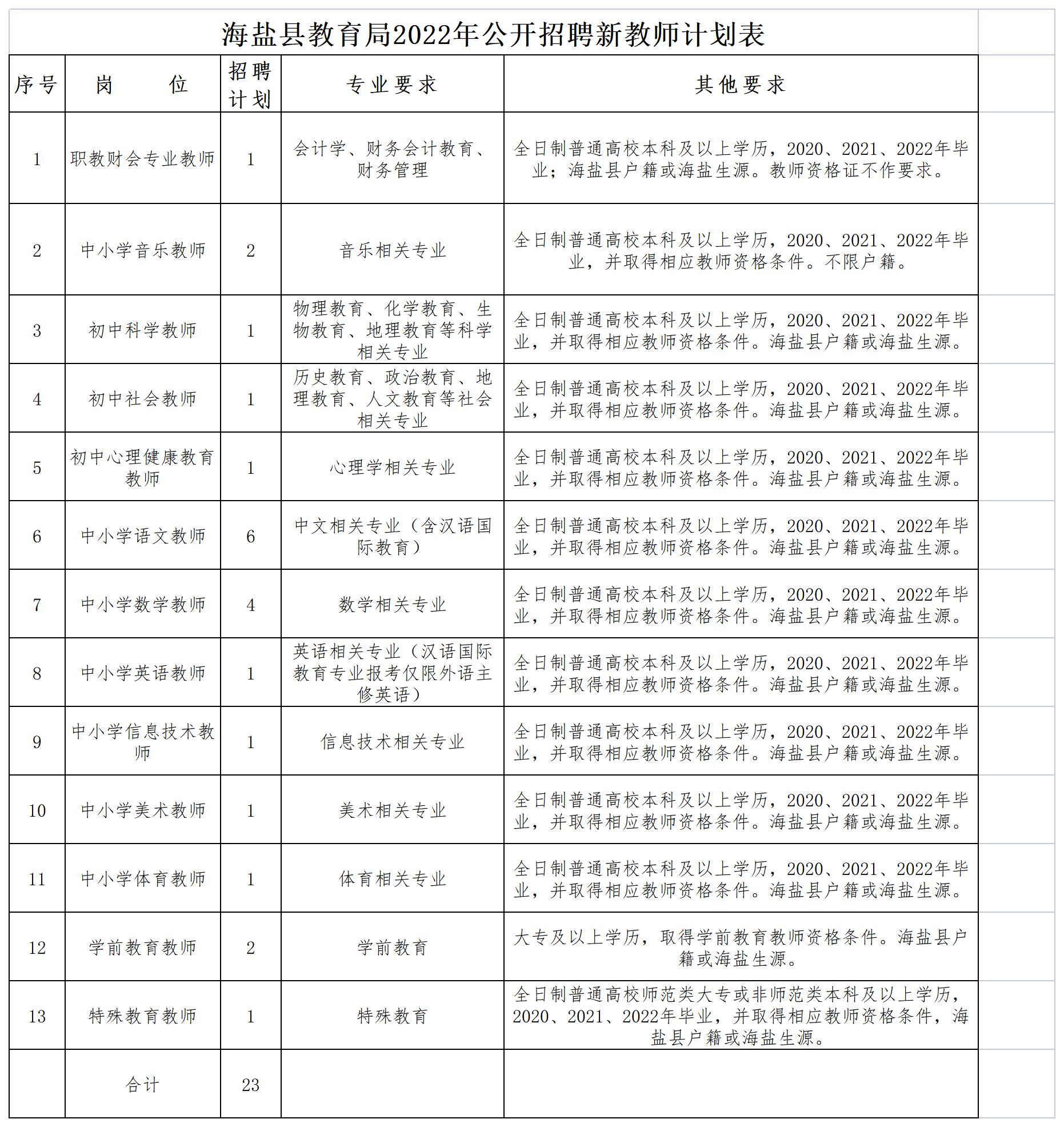 为进一步完善“公开、平等、竞争、择优”的进人、用人机制,吸引优秀人才从教,努力提高教师的整体素质,根据《海盐县事业单位公开招聘人员暂行办法》的有关规定,结合本系统新教师补充工作的实际情况,并经县有关部门核准,现将2022年公开招聘新教师相关事项公告如下: