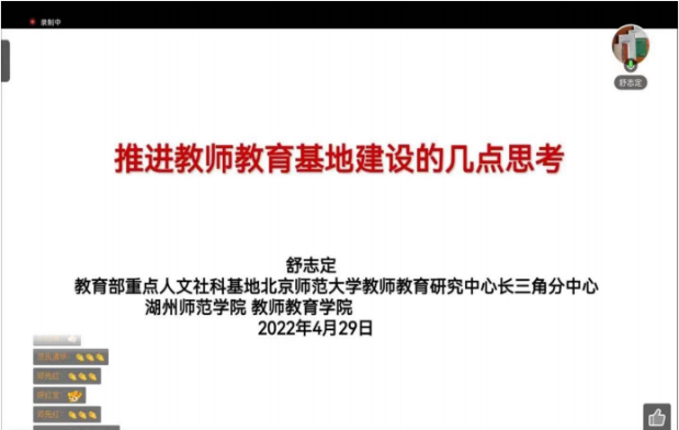 2022年4月29日,教育部普通高校人文社会科学重点研究基地北京师范大学教师教育研究中心举办《新时代基础教育强师计划》专题研讨会。我校作为北京师范大学教师教育研究中心长三角分中心组织教育学科相关师生在线参会,副校长舒志定教授代表长三角分中心做主题发言。
