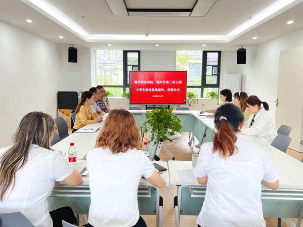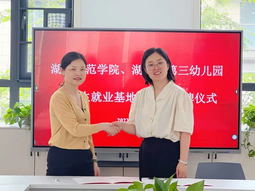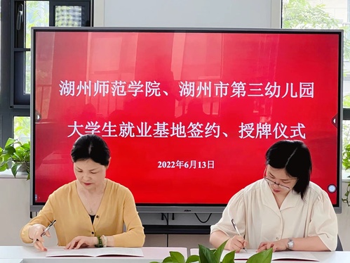 为深入落实就业工作“一把手”工程和访校拓岗专项行动,进一步做好2022届毕业生就业工作,提前为2023届毕业生就业工作做好准备,6月13日上午,我院党委书记何阅雄、党委副书记朱竞、学前教育学系教师党支部书记俞睿玮、学生就业负责老师赴湖州市第三幼儿园举行大学生就业基地签约授牌仪式,湖州市第三幼儿园园长曹懿、副园长朱珏珏参与仪式。