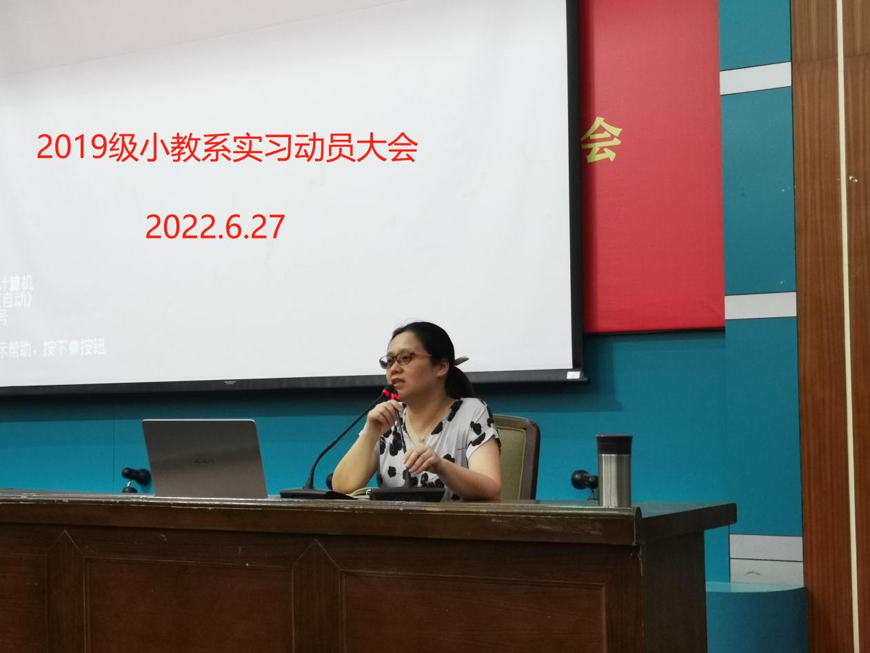 6月27日晚上,小教系在7幢303报告厅召开了2019级学生实习动员大会。会议由小教系支部书记刘佳主持,小教系主任王燕红、副系主任王贤德、朱宇波、副书记陆韵、各实习带队老师以及2019级全体学生参加了会议。