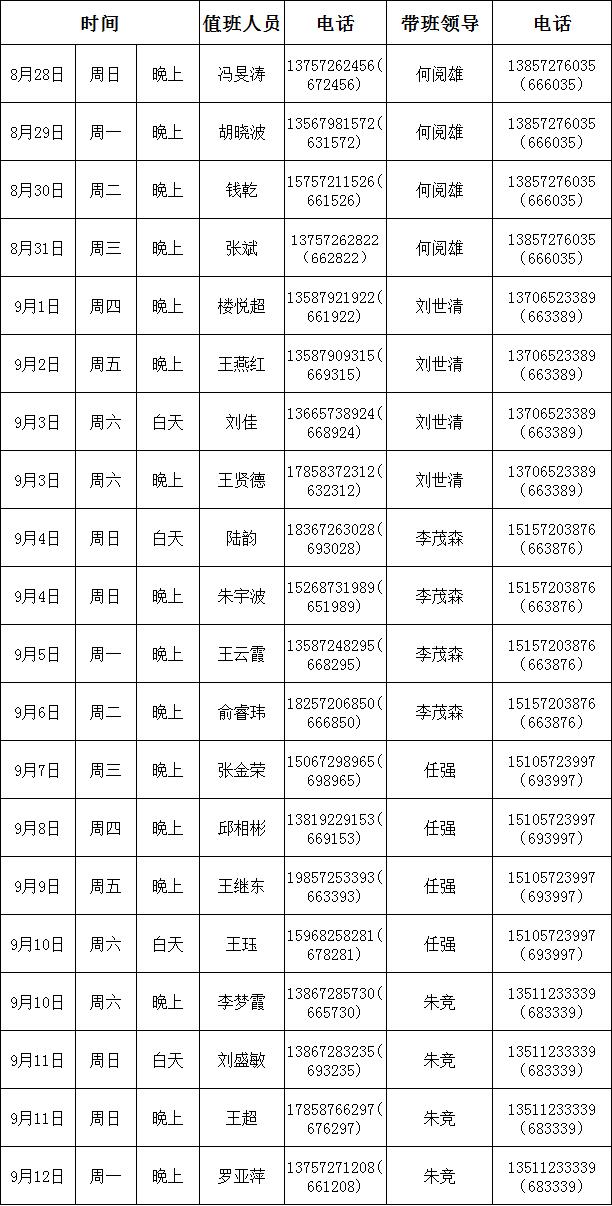 js3845金沙线路秋季开学值班安排表 (8月28日-9月12日)