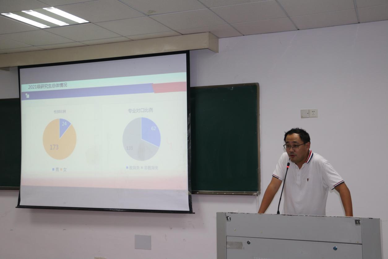 任强副院长重点介绍了学院的办学历史、学科特色、师资结构、人才培养、社会服务、国际合作等基本情况。他向研究生新生介绍了学院学位与研究生培养办的两位老师、学工办负责研究生日常管理的两位辅导员老师,并对研究生的学习、科研提出了殷切希望。他表示,每一位新生都是学校新的代言人,同学们要尽快适应新角色,对自己提出新要求,在师院获得新发展。