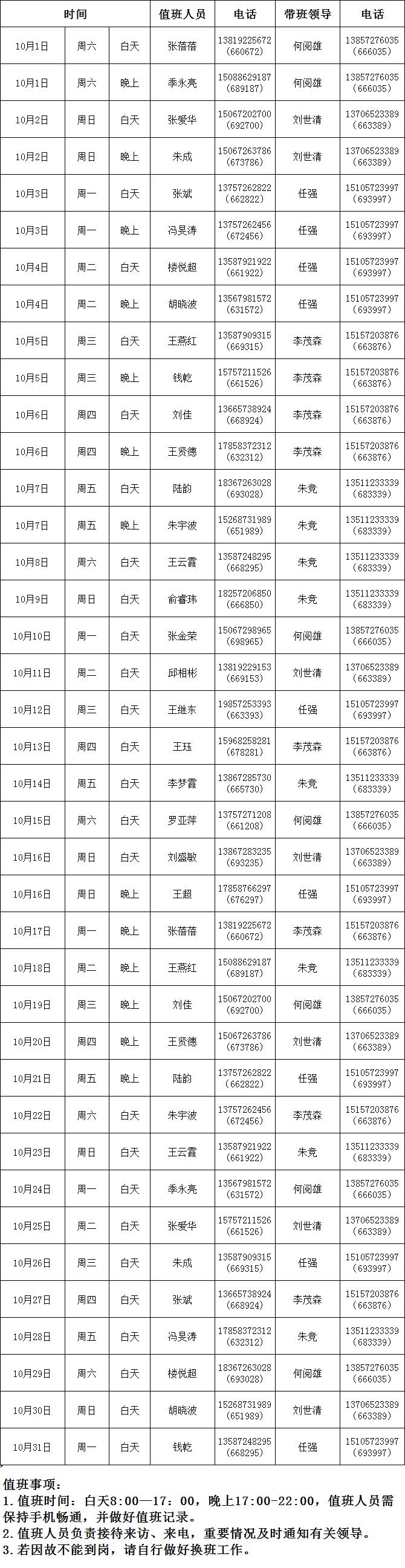 js3845金沙线路10月值班安排表 (10月1日-10月31日)