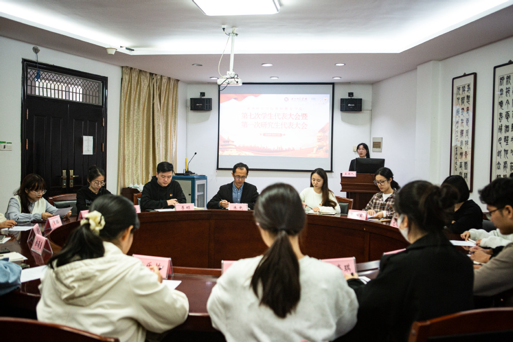 10月11日,js3845金沙线路第七次学生代表大会暨第一次研究生代表大会于学院11-111会议室顺利召开,本次会议有线上线下双渠道同步进行。学院党委副书记朱竞,辅导员李硕、吴霜,学院团委学生会各中心负责人,研究生会主席团及全体正式代表出席本次大会。大会由学生会办公室主任陈温迪主持。