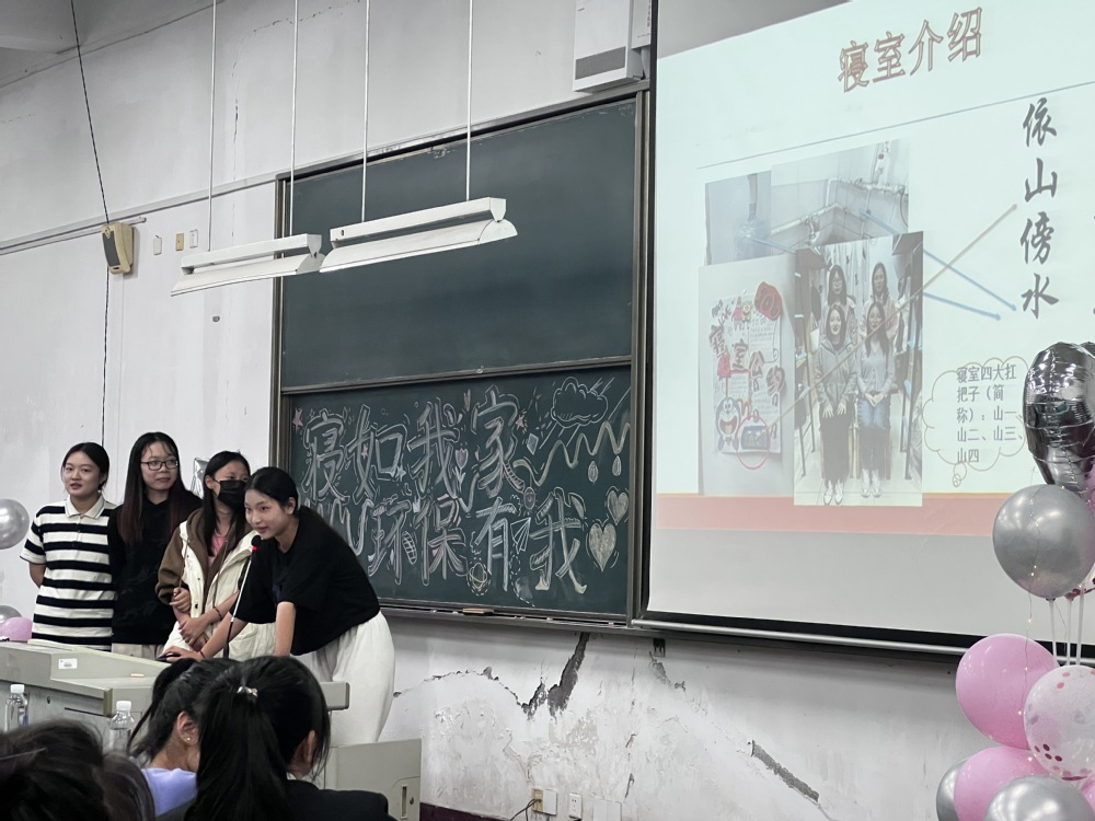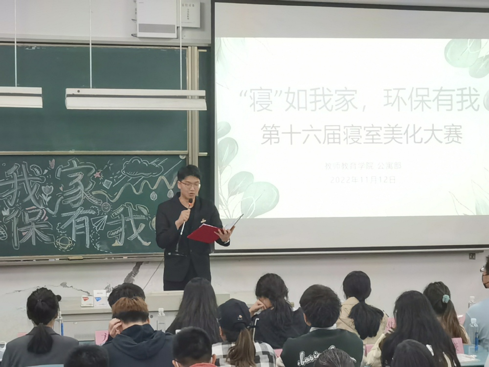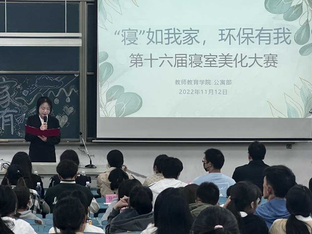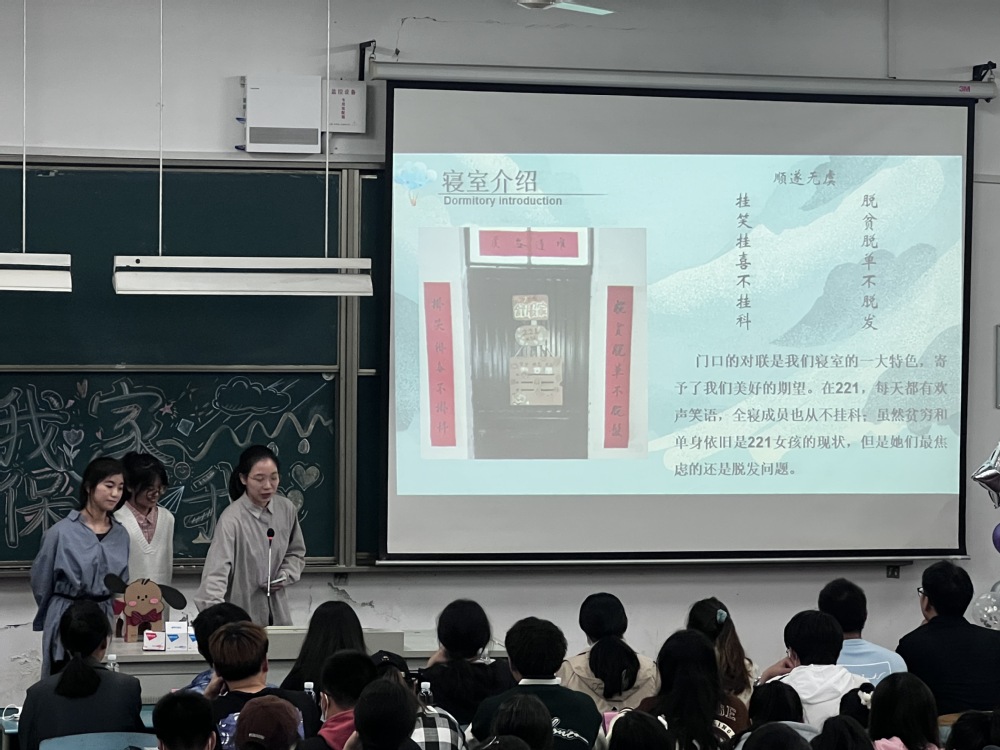 本届寝室文化节以“寝如我家,环保有我”为主题,旨在通过学生宿舍这个媒介在全体学生中倡导绿色生活,节约资源,助力绿色校园创建。比赛过程中,参赛寝室以PPT、视频等形式分别展示了寝室门牌,logo以及特色照片,部分寝室用清新绿植打造天然氧吧,用书法佳作点缀空白墙面,旧物改造、变废为宝更是呼应环保主题。大家用丰富的想象力、灵巧的双手和十足的默契将各自的寝室文化展现得淋漓尽致。此外,中场环节进行了环保知识问答活动,观赛同学积极参与,踊跃发言,为比赛增添了几分乐趣。