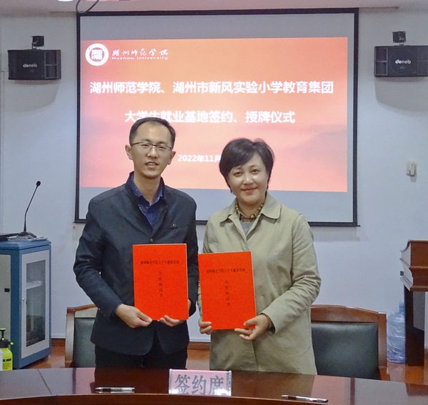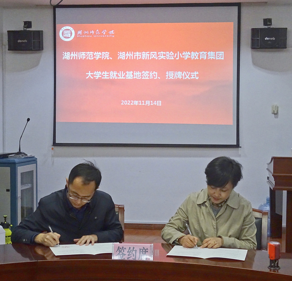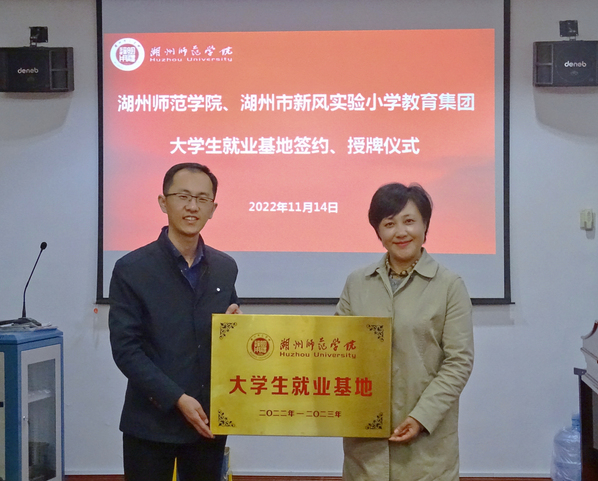 为进一步做好2023届毕业生就业工作,服务地方教育事业发展,1114午,我院党委副书记朱竞,党委委员、小学教育系主任王燕红,小学教育系教师党支部书记刘佳,青年博士沈茜、张宗倩,学生就业负责老师陈俊宏,团学负责老师吴霜与湖州市新风实验小学教育集团举行大学生就业基地签约授牌仪式,湖州市新风实验小学校长邓承敏,德育处主任杨月飞参与仪式。