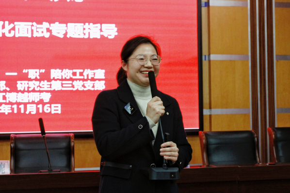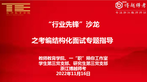 为深入践行党的二十大“科教兴国”战略,促进毕业生就业,2022年11月16日晚18:30,js3845金沙线路、一“职”陪你工作室、学生第三党支部和研究生第三党支部于中校区10-512开展“行业先锋”沙龙之考编结构化面试专题指导活动由学院负责学生就业老师主持,邀请专业指导教师李旎为学生答疑解惑,2023届毕业生通过线上线下形式参加讲座,本次活动由浙江博越师考支持
