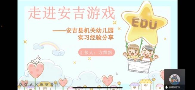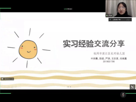 本次2019—2020跨年级实习经验交流分享会是实习经验交流与分享的最后一个阶段。由于疫情原因,此次交流分享会采用了线上线下混合的方式开展。2019级共8位优秀实习生进行了线上的分享, 2020级本科及专科5个班级的学生在10幢512、508、310进行了聆听,会议由学前教育学系教工支部书记俞睿玮主持。