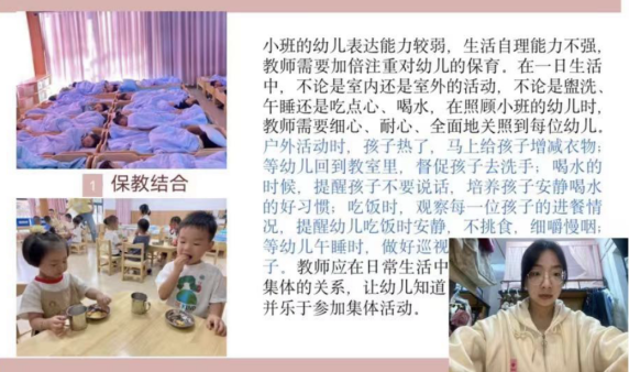 此前,为了拓宽实习生对不同幼儿园、不同年龄段课程和教育理念的认知,切实提升实习效果,在实习带队教师和班主任的协同努力下,实习生已经先后开展了实习小组经验交流和班级内实习经验交流。