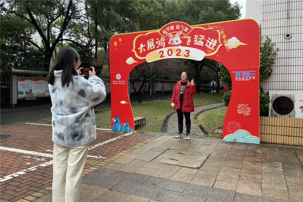 花式开学,以心迎新。本学期是疫情后校园首次对家长开放,为营造开心温暖的氛围,学院在10幢楼内外设置多处打卡点。由东侧入口进入,映入眼帘的是“大展宏兔”展板,其上缀满“崇仁精业”“意气风发”“扬帆把舵”等词条,饱含对新学伊始的热忱期待;穿过“新气象”拱门,寓意着学生们怀着对新学期的美好憧憬,以崭新面貌,开启新的学习之旅。家长和学生们纷纷合影打卡,为新学期“讨”个好彩头。