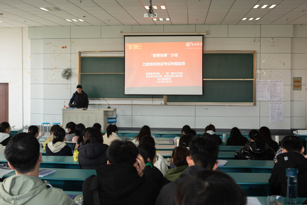 为帮助在校生更好地准备2023年上半年教师资格证考试,提高笔试通过率,2023年3月5日,学生第三党支部、研究生第三党支部、一“职”陪你工作室联合于东校区30-326开展“智慧先锋”沙龙之教师资格证考试专题指导活动,邀请专业指导教师为学生答疑解惑,本次活动由浙江博越师考支持。