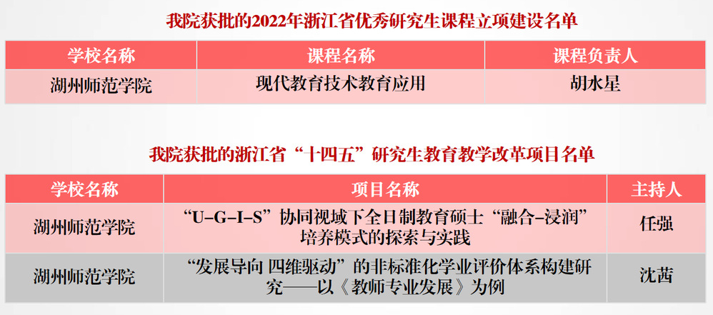 省级优秀研究生课程建设项目由浙江省教育厅办公室组织申报,省“十四五”研究生教育改革项目由浙江省学位委员会办公室组织申报。省级优秀研究生课程建设及研究生教育改革项目建设,旨在深化研究生教育教学改革,加强研究生优质教育资源和成果共享,切实提升研究生培养质量。