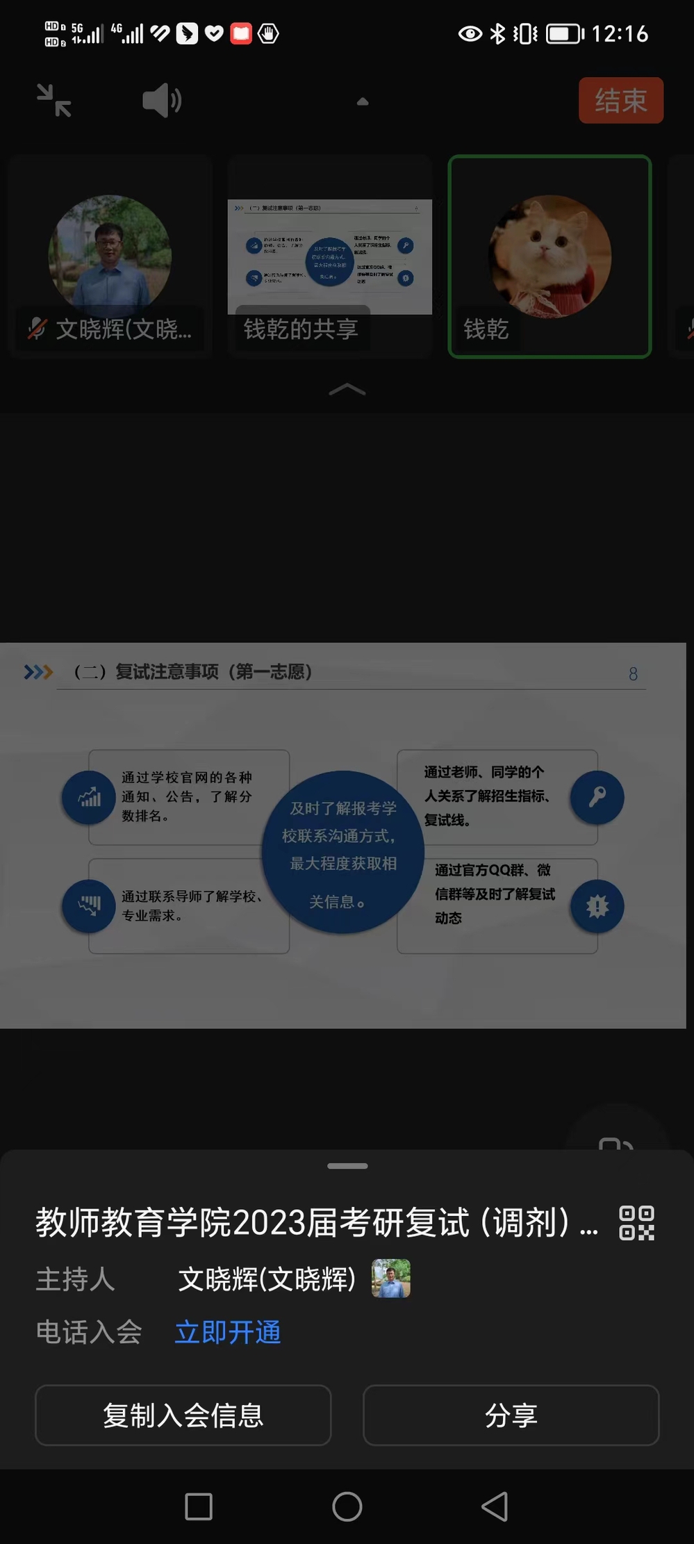 此次活动通过线上钉钉视频会议的方式进行,主要围绕2023年考研上线形势、如何备考复试、调剂院校选择、信息获取等多个方面向学生们讲解了具体考研复试(调剂)流程中需要特别注意的问题,也分享了考研面试中着装礼仪、心态调试方面的建议,最后针对同学们提出的个性化问题进行了详细的解答。此次活动使与会同学备受鼓舞,明确了备考复试和选择调剂的具体方向,掌握了高效的备考方法与技巧,以更积极乐观的心态迎接考研复。