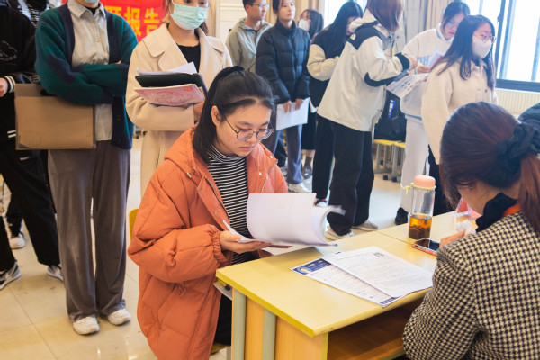 宣讲结束,应聘学生向招聘负责人递交报名表、个人简历及教师资格证等材料,并对课业成绩、大学经历、所获荣誉等进行简要汇报。应聘学生递交报名材料后,安吉技师学院负责人与报名应聘学生就校园经历、荣誉奖项方面进行交流,并作为择优选拔面试对象的参考条件。