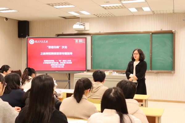 3月22日“思想先锋”沙龙之教师招聘微型课专题指导活动,邀请到屠天源教授和马利云教授分别从数学和语文方向对近期参加教师招聘面试学生和暂未就业学生进行专项考编辅导,学院本科生和研究生报名参加。