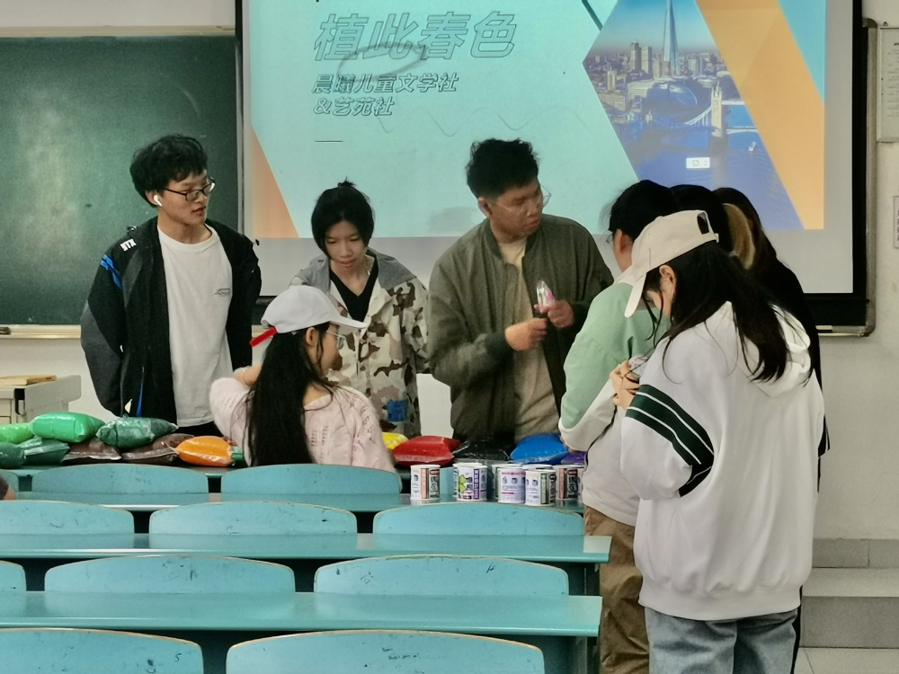 在充满生机的四月,在播种希望的春天,为了丰富同学们的课余生活,抒发大学生的美好意志,4月15日下午,我院晨曦儿童文学社和艺苑社在12-401联合举办“植此春色”罐头植物制作活动,活动内容丰富有趣,吸引了大量学生前来参加。