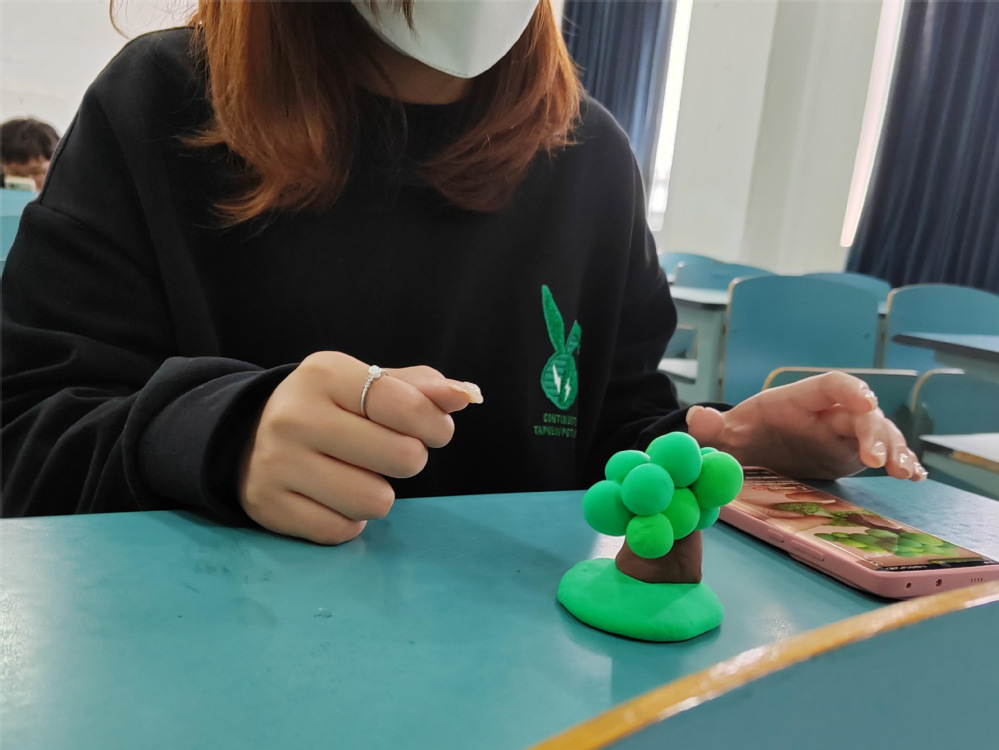 活动分为制作黏土植物和播种罐头植物两个环节。同学们发挥想象,利用彩色超轻粘土,制作成一个个精美的植物摆件。随后,在工作人员的指导下制作罐头植物,罐头原本是储存食物的,利用罐头制作育苗杯,也意味着存储希望,同学们纷纷开启罐头,播种下“含羞草”“向日葵”等植物种子,创作出属于自己的五彩斑斓的“春之树”,体验养成系的快乐!最后,同学们纷纷发表活动感悟,表示期待看到种子早日发芽。