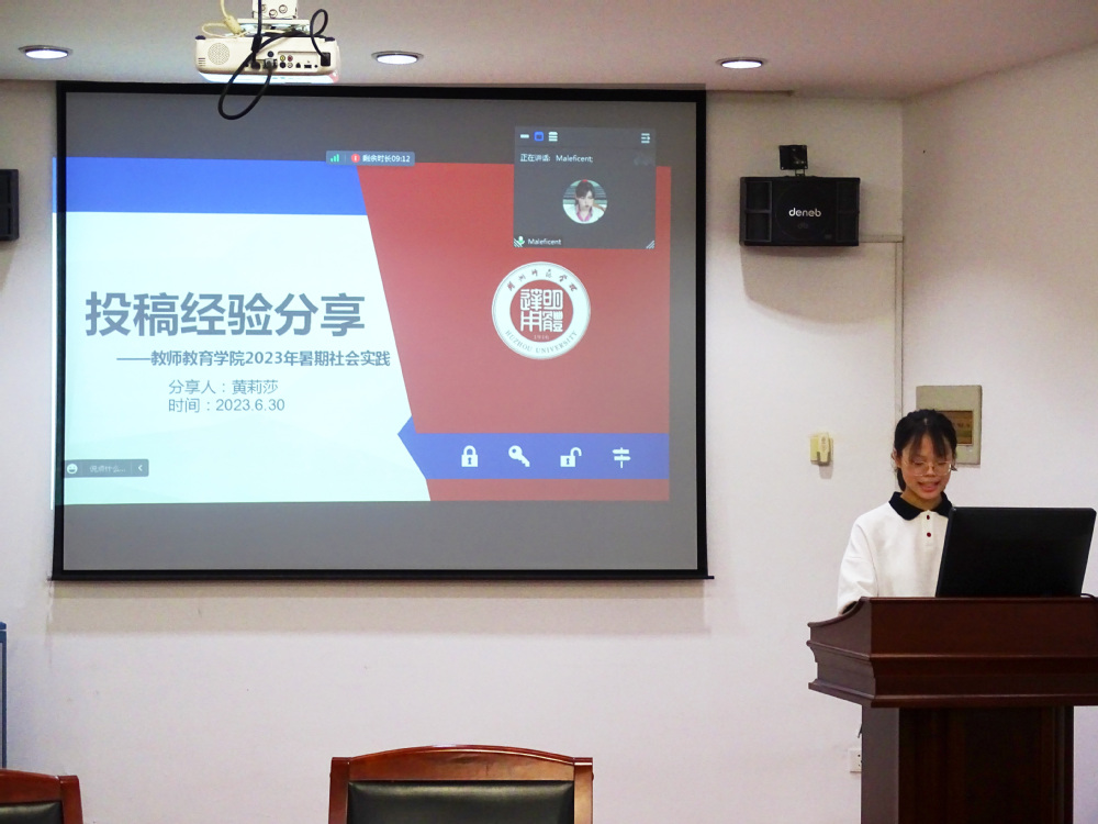 2022年暑期社会实践校级最佳宣传个人代表黄莉莎作新闻稿写作技巧、投稿流程的经验分享。她通过分析优秀新闻稿件的方式,简明扼要地阐述新闻稿件导语、主体、结语的要求。自由交流环节中,2022年暑期社会实践先进个人代表周雨婷、鲁嘉琪、包纯营向团队成员做政策要求、评奖评优、新闻宣传等方面的解读和分享。而后,校级重点团队“青柚空间”——暑期流动少年宫服务实践团负责人林莹姿作表态发言,她表示今年作为全面贯彻党的二十大精神的开局之年,希望同学们都能承载学校与学院的殷切希望,于实践中发扬有理想、敢担当、能吃苦、肯奋斗的精神。