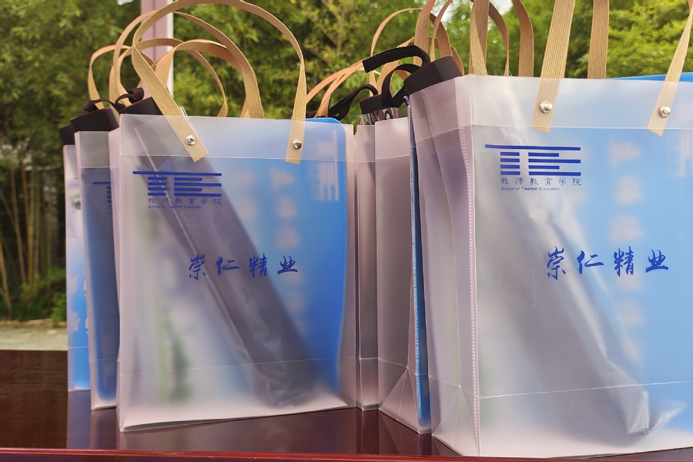 “礼”相遇,“包”满意。一份份新生礼品包含着学院对新生们的期许和关心,带有院铭——“崇仁精业”的定制晴雨伞,蕴意着“学院与你风雨同行”,印有院训——“立师德、铸师魂、养师风、练师能”的鼠标垫,蕴意着“教院精神伴你左右”。这些文创礼品既能让新生感受到学院深厚的文化魅力,院铭院训也将鼓励他们在未来的学习生活中努力拼搏,追求卓越。