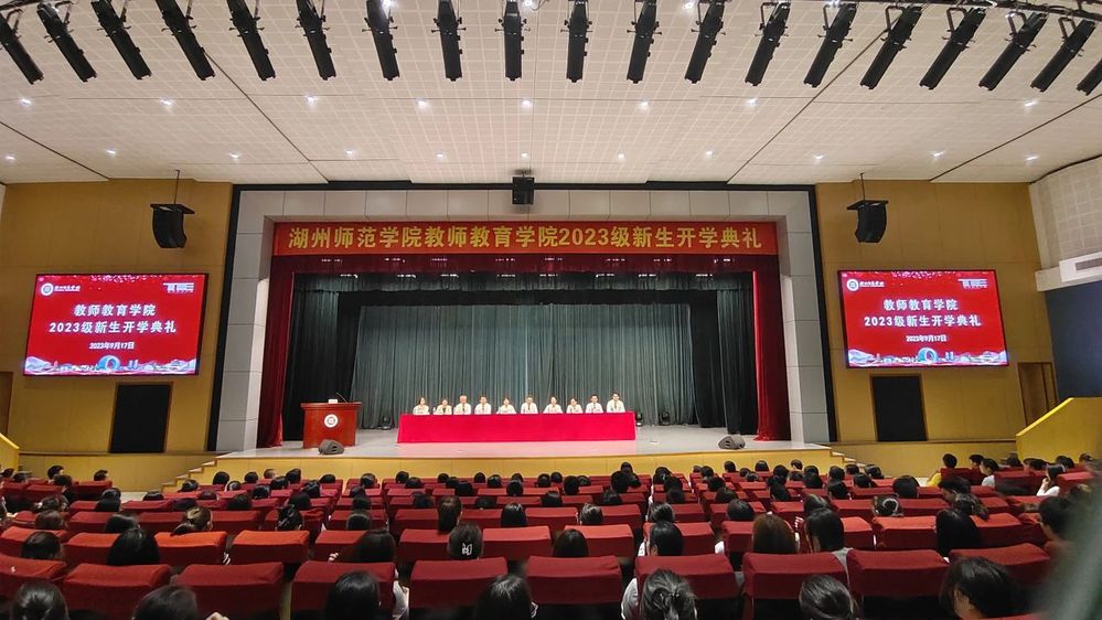 2023年9月17日9:40,js3845金沙线路我院2023级新生开学典礼在大学生活动中心举行。js3845金沙线路党委书记何阅雄,副院长李茂森,副院长任强,党委委员李文兵,党委委员、小学教育系系主任王燕红,学前教育系系主任王云霞,教育技术学系系主任邱相彬,心理学系系主任王超,教育学博士、青年教授李梦霞出席本次典礼。新生班主任、学工办全体辅导员及2023级全体新生(含研究生)参会。本次典礼由js3845金沙线路党委副书记沈卫主持。