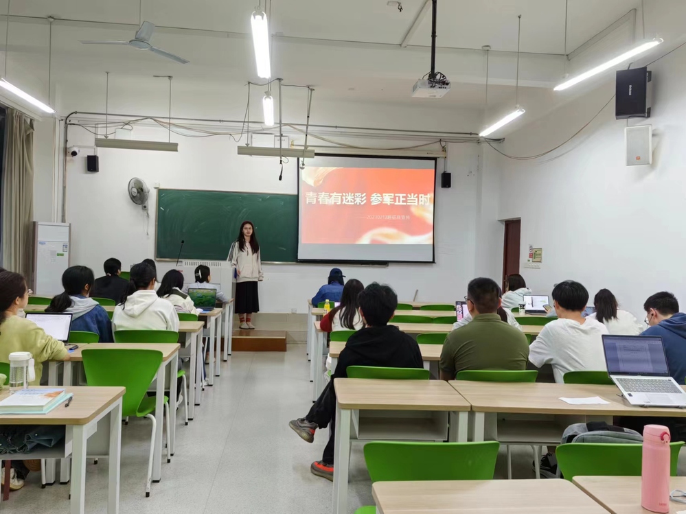 活动伊始,学院通知所有班级积极组织开展主题班会。在各班宣传委员认真组织下,详细解读国家征兵政策,普及国防知识,让同学们对参军入伍有了更加深入清晰的认知;同时,以主题班会为契机,班级还通过组织观看爱国主义主题短片、退役军人分享会、参观爱国主义教育基地等形式宣传红色革命精神。让同学们深深体会到革命先辈的不易及军旅生涯的风采,进一步激发学生的参军热情和爱国情怀,增强民族认同感与自豪感,点燃报国之志。