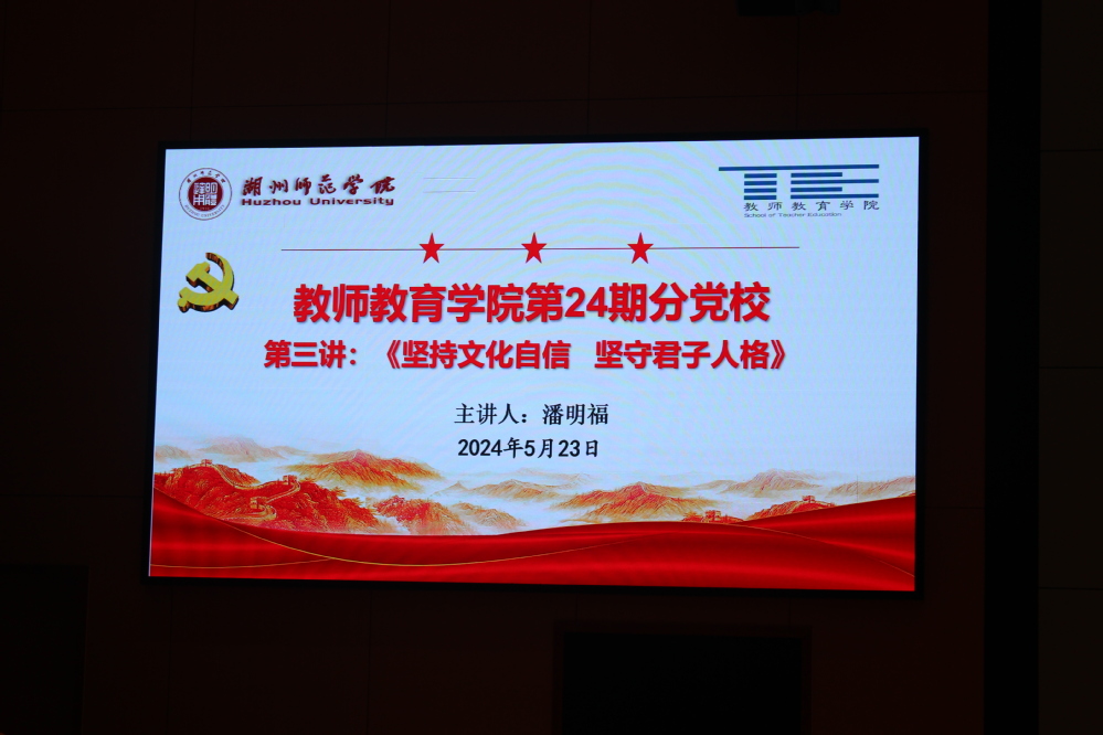 习近平总书记在党的二十大报告中提到:要“传承中华优秀传统文化,满足人民日益增长的精神文化需求”,同时要“用社会主义核心价值观铸魂育人”。为了传承和弘扬君子之风,坚定文化自信,5月23日晚,js3845金沙线路第24期分党校第三讲以“坚守文化自信,坚守君子人格”为主题,在大学生活动中心顺利开讲。本期党课由js3845金沙线路人文学院教授潘明福主讲,分党校全体成员共同参与。
