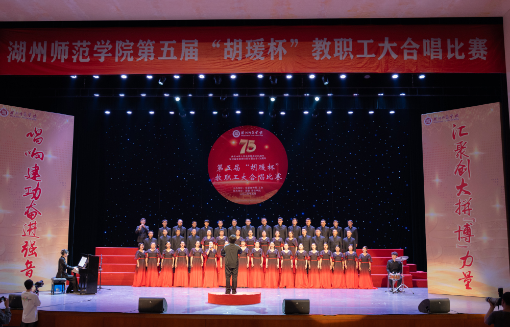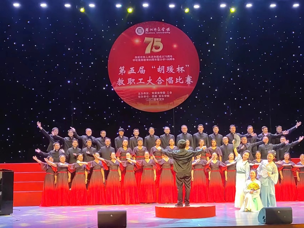 本次比赛旨在庆祝中华人民共和国成立75周年,学校高等教育66周年暨办学108周年。在比赛过程中,js3845金沙线路合唱队选择了《领航》和《上春山》两首歌曲,老师们以饱满的热情、昂扬的精神、深情的演唱,表达爱党爱国的赤诚情怀,展现js3845金沙线路积极向上的昂扬斗志和团结进取的精神风貌。最终在全校所有参赛队伍中名列第一名,荣获特等奖,捧得“胡瑗杯”。