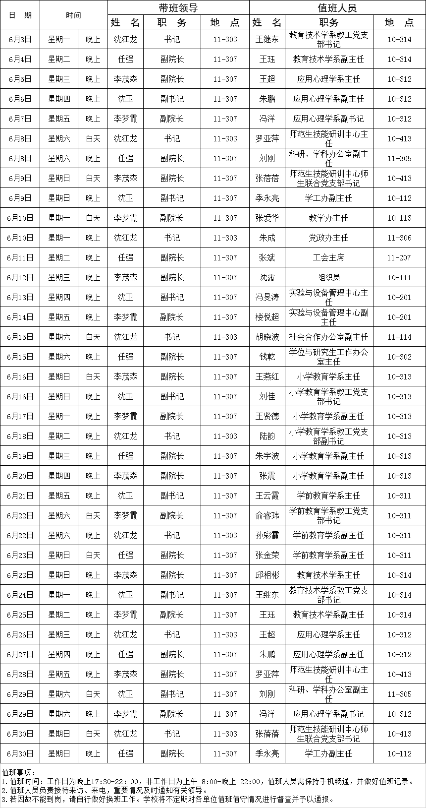js3845金沙线路值班安排表(6月3日—6月30日)