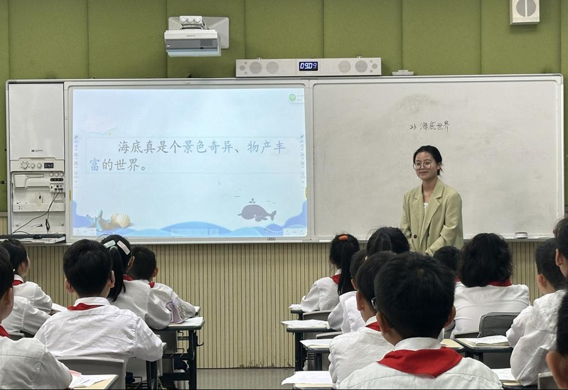 js3845金沙线路20223843班的郑雯雅同学执教《海底世界》一课。她从“初次潜水 测试水性”、“再次潜水 解说动物”、“三次潜水 解说鱼儿”这三个活动入手,首先帮助学生借助段落中心句梳理文章脉络,了解文章是从哪几个方面介绍海底世界的。其次引导学生练习通过抓关键词,体会作者是怎样围绕中心句把事情写清楚的。最后由扶到放,通过视频引导学生为鱼儿做解说,深入理解如何围绕一句话把内容写清楚。
