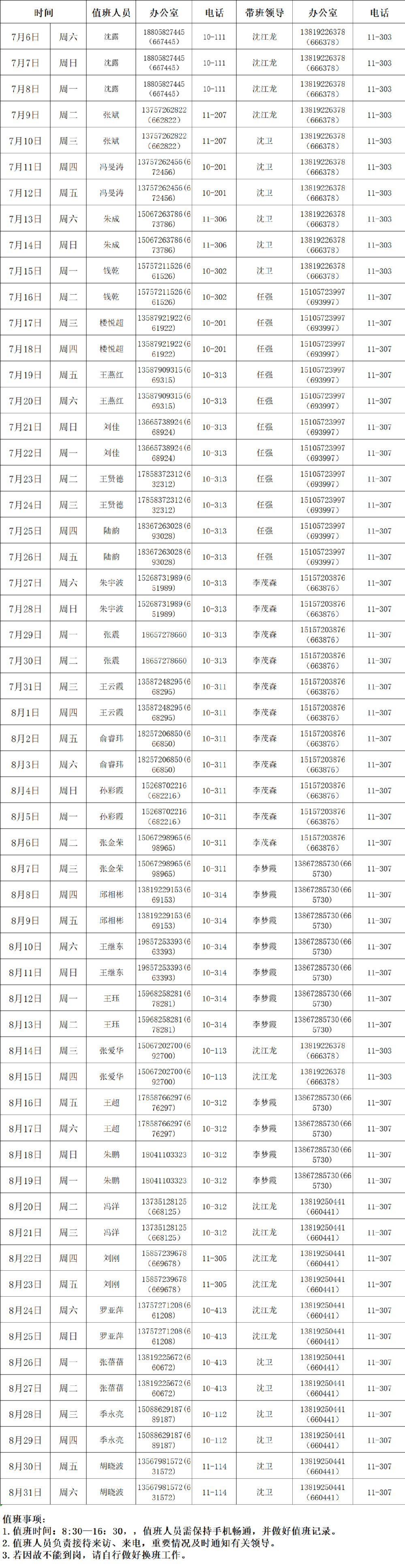 我院2024年暑假值班安排表 (7月6日-8月31日)