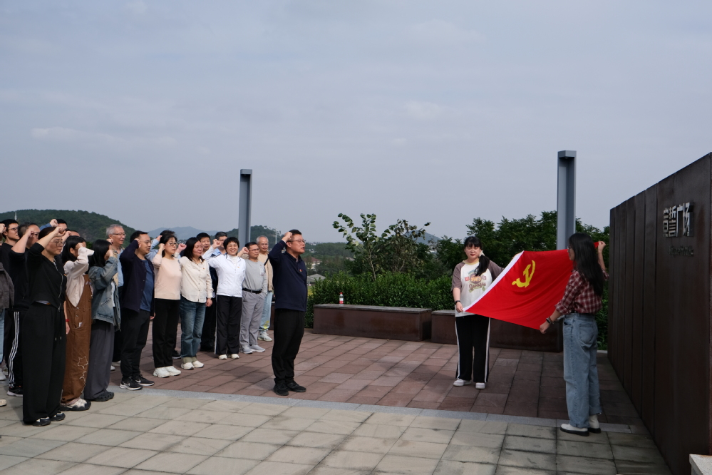 全体党员同志首先来到了澉浦突围战主题广场,一起认真学习了发生在1945年新四军浙东纵队艰难突围,英勇奋战的历史。随后全体党员同志爬上南北湖东部的荆山山顶,瞻仰新四军北撤澉浦之战纪念碑,在革命纪念碑前重温入党誓词。支部全体党员面对党旗重温入党誓词,铿锵有力的誓言在山顶回荡,不仅是对个人入党初心的再次确认,更是全体师生党员勇担使命,不懈拼搏的庄严承诺。