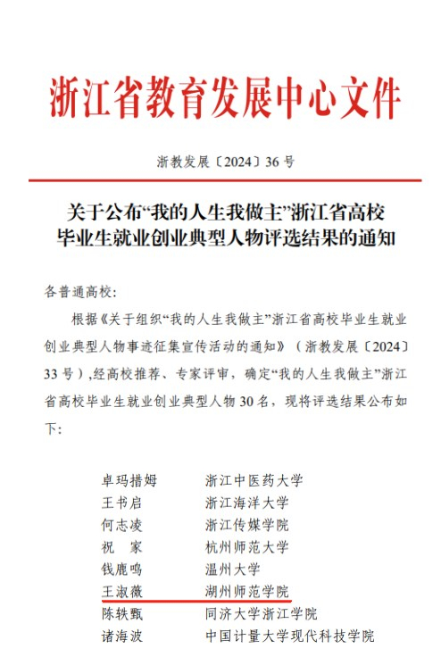 日前,省教育发展中心主办的“我的人生我做主”浙江省高校毕业生就业创业典型人物事迹征集宣传活动人物名单公布,全省30名优秀毕业生入选。我院2015级学前教育(师范)专业毕业生王淑薇同学成功入选全省高校毕业生就业创业典型人物。