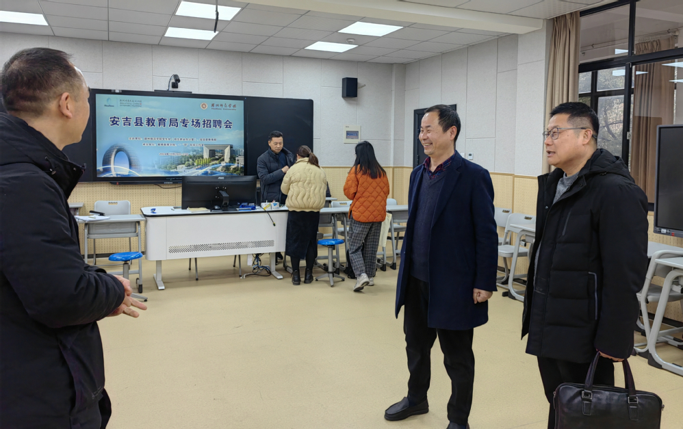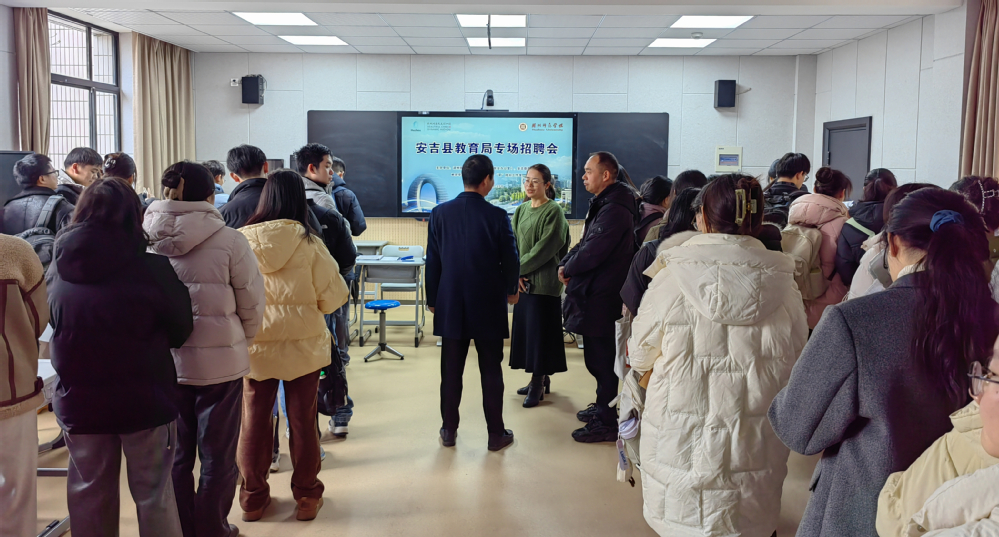 为促进学院2025届毕业生更充分更高质量就业,提供“小而精·专而优”的校园招聘服务,学院于12月26-27日在中校区10-512举办安吉县教育局专场招聘会。学院党委书记沈江龙、执行院长李茂森、党委副书记沈卫到场指导,安吉县教育局、人社局相关负责人,来自校内外200余名毕业生参加本次专场招聘会。