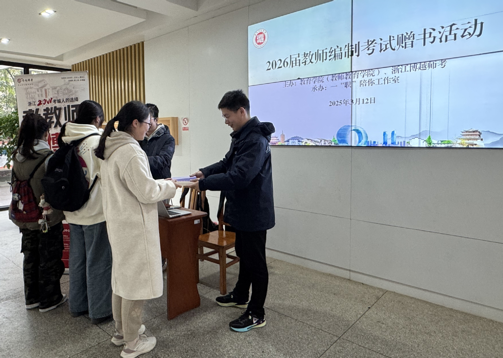 在活动现场,学生有序领取由博越师考赞助的《2026年浙江省教师招聘考试校招备考指南》《学生学姐说考编》等书籍,部分学生现场咨询省内各地2025年校招考情,了解各县区教师岗位招聘人数变化情况,交流如果规划考编复习等。