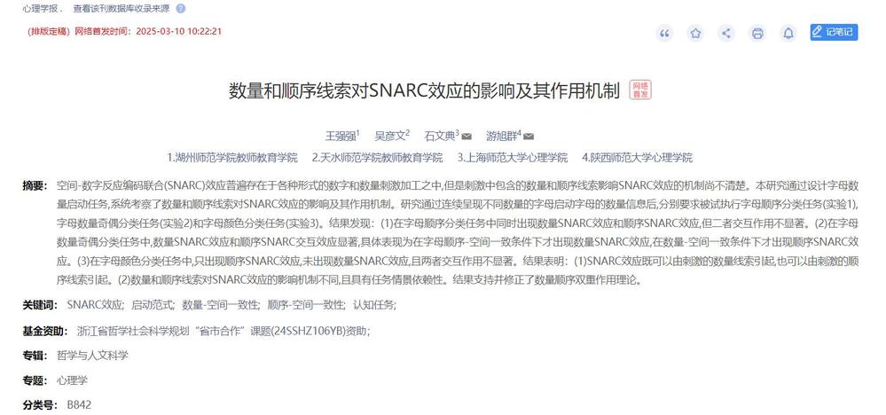 [权威期刊论文]《数量和顺序线索对SNARC效应的影响及其作用机制》